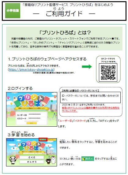この度、大阪市教育委員会より子どもたちが授業を十分に受けることができないことによって、学習に著しく遅れが生じることがないよう、家庭向けプリント配信サービス「問題データベースプリントひろば」の利用案内がありました。