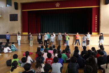 2年生は、「九九の歌(奇数バージョン)」「あいうえおおさか くいだおれ」「うち知ってんねん」を発表しました。新しく覚えた九九をリズムに乗って歌い、元気に詩を発表していました。