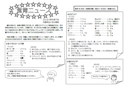 5月の食育ニュースを発行いたしました。今回は、子どもたちに人気の給食をご家庭でも味わっていただけたらと作り方を載せています。