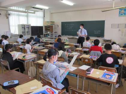 教室で課題を集めたり手紙を配布したりした後、講堂で簡単なストレッチ体操をして体をほぐしました。学校休業中は外出するのが難しいので、ストレッチで体をのばして気分もスッキリ。心もほぐれて、しぜんと笑顔が明るくなりました。