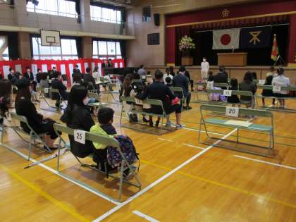 講堂では1年生と保護者の方に一緒に座っていただき、学校長から入学をお祝いするお話をしました。また続けて、クラスを受け持つ担任の先生や、学校生活で1年生を支援する教職員の紹介をしました。