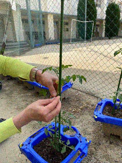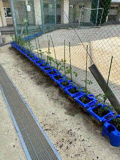子どもたちと植える予定だったミニトマトの苗が、とても大きく育っていたので、担任の方で植木鉢への植え替えを行いました。休校中の水やりは先生がしますね。