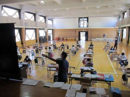 6年生は講堂と教室に分かれて、算数の学習をしました。学校休業中に担任の先生から渡された課題のプリントを机の上に出して、順番に〇つけをしていきました。