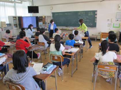 広い講堂での授業は、まるで大きな教室で行われている大学の講義のようです。慣れない環境ですが、さすが6年生の子ども達です。先生のお話をしっかりと聞いて、授業に取り組んでいました。