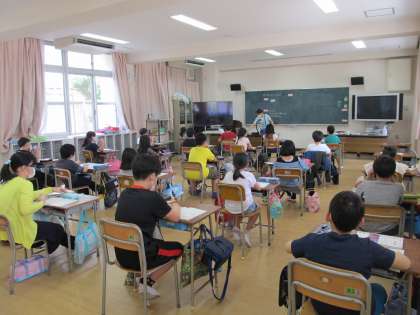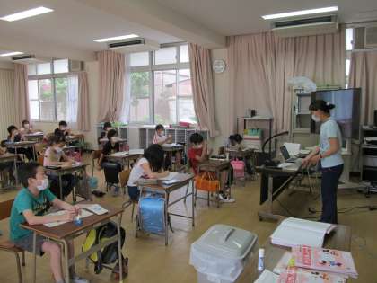 先週までクラスを2つに分けて登校していた4年生は、今日から大きな部屋に引っ越しをして全員で授業をします。