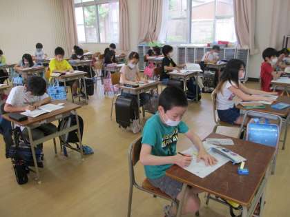朝、登校してきた子ども達で、必要なものを1階の多目的室におろしていきました。多目的室は教室の2倍ほどの広さがあるので、机と机の間をあけて座ることができます。