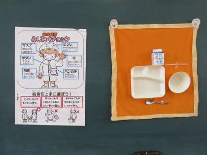 1年生の子ども達も、小学校の給食をすごく楽しみにしていました。担任の先生のお話をよく聞いて、間をあけて一人ずつ順番にお皿をもって並びます。ゆっくりと運んだお皿と牛乳は、黒板のお手本どおりに机の上に並べました。