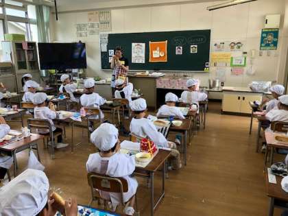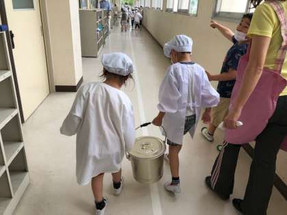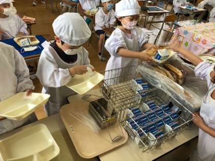 1年生にとって初めての給食でした。給食当番は、教室まで食缶、パン、牛乳を慎重に運びました。配膳は、自分の分は自分で上手に運んでいました。この2週間は、パンは個包装なので、袋から出さずにかじって食べていますが、基本は、パンはちぎって食べるように指導します。今日はさつまいもの入った「おさつパン」でした。「あまくてふわふわでおいしい。」「おみそ汁おかわり」と一年生もよく食べていました。