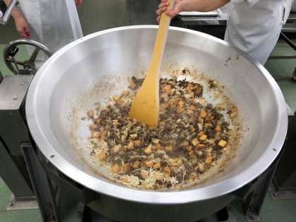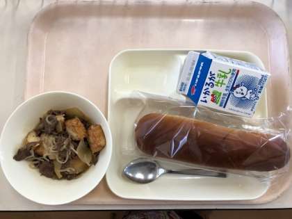 2日目の給食は、「黒糖パン、牛乳、すき焼き煮」でした。甘辛いすき焼き煮は児童に大人気でした。