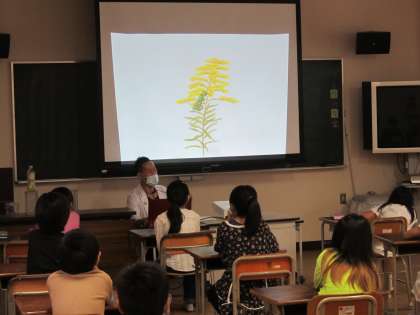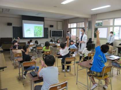 カマキリ先生は3歳のときに、お庭でカマキリを見つけて大好きになったそうです。それ以来、絵を描くのもカマキリ、耕作するのもカマキリ。子どもの時のワクワクを持ち続けて、カマキリや昆虫のことを研究するまでになったそうです。授業では子ども達に、「みんなの夢はなんですか?」、「将来は何になりたいですか?」と優しい笑顔で子ども達に問いかけられていました。