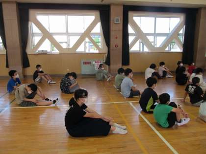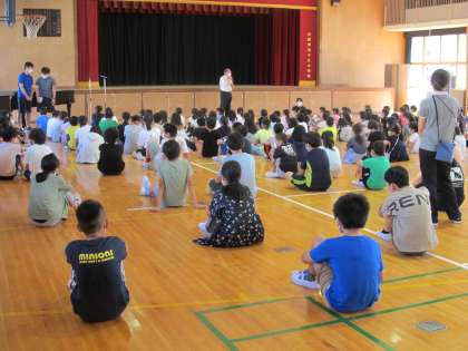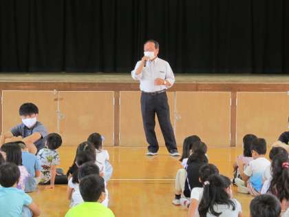 「校長先生は、小学生の時に転校をしました。話すときのイントネーションが違ったんですね。国語で教科書を音読したときに、間違えずに読んでいるのに周りからクスクスと笑われたんです。校長先生はその時、すごくイヤな気持ちになりました」。児童朝会ではご自身の体験を交えて、子ども達にいじめのお話をされました。優しく語りかける校長先生のお話を、子ども達は真剣な表情で聞いていました。