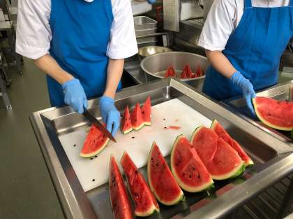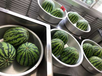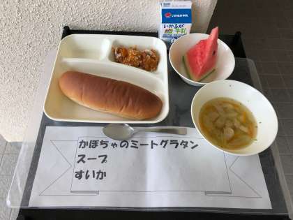 今日は「かぼちゃのミートグラタン、スープ、すいか、黒糖パン、牛乳」でした。年に一度だけ給食にでてくるすいかは、季節を感じさせるものでした。給食室で一玉を64等分に切りわけて、子どもたちにもちょうどよく食べやすい大きさで、とてもあまくておいしいすいかでした。