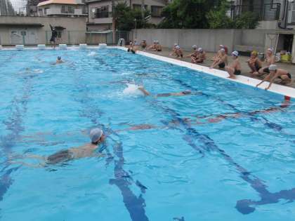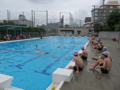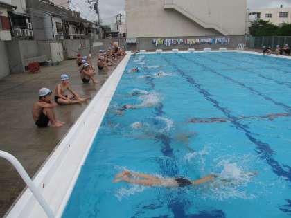 しっかりと準備体操をして、水慣れから始めます。くもり空でお日様が隠れていたこともあり、どちらかと言うと水の中の方があたたかく感じる水温でした。高学年の水泳なので、蹴のび、バタ足とどんどん泳ぐ練習を進めていきました。