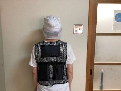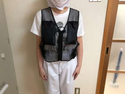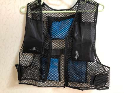 8月の給食室はとても暑いです。暑い中、作業が少しでも快適にできるように、アイスベストを購入しました。写真にあるアイスベストはメッシュのもので、保冷剤が5つはいるようになっています。給食調理員さんは、アイスベストを装着した上に調理服を着ます。なので、調理服はアイスベストでぬれてしまいますが、暑い中では、役立っています。