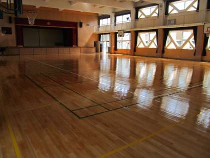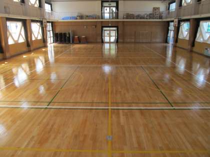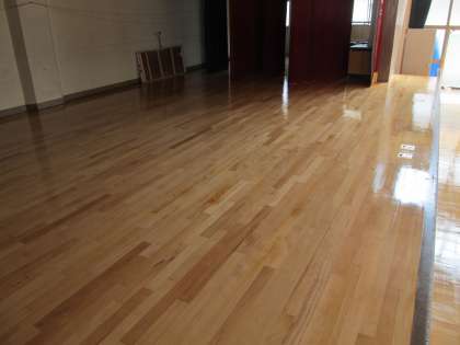 講堂の床面が痛んできたたので、整備と塗装をしました。講堂の荷物を全部出して、まずは以前の痛んでいた床面をけずります。次に新しく塗りなおして、最後にラインを引きます。