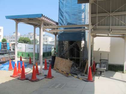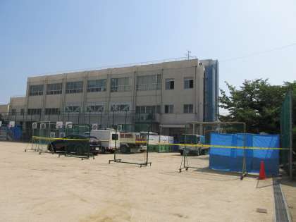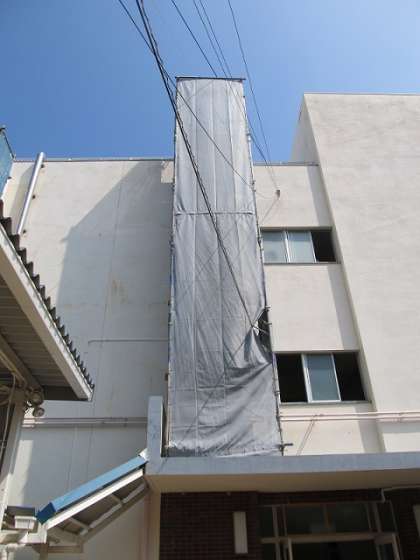 夏の工事がもう一つ。講堂棟の3階のトイレがきれいになります。こちらは大掛かりな工事になるため、8月に入ってから運動場の一部を囲って工事関係の車が入っています。