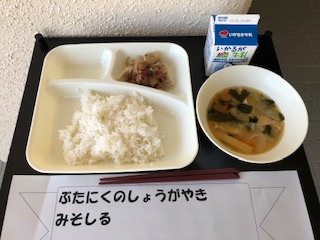 今日から2学期です。給食も始まりました。「豚肉のしょうが焼き、みそ汁、ごはん、牛乳」でした。残暑がまだまだ厳しいですが、しっかり食べてげんきに過ごしてほしいと思います。