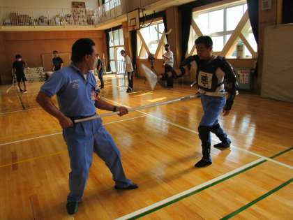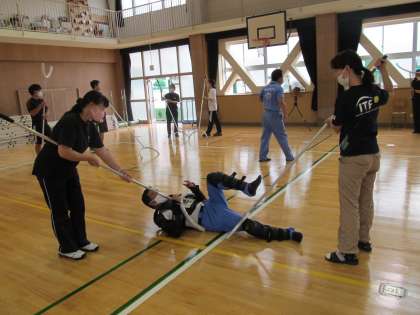 まずは講堂でさすまたの使い方を教えていただき、ペアを組んで実際に練習をしました。凶器となる物に注意をはらうこと、さすまたなど長い物を用いて不審者との距離をること、また複数の人で対応をすることなど、実演を交えて具体的に指導していただきました。