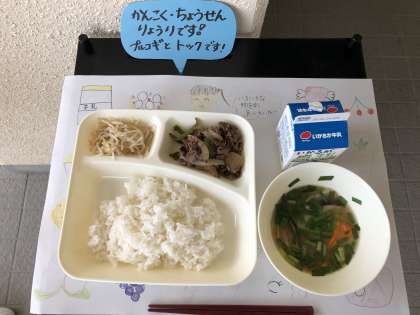 今日は韓国・朝鮮料理で、「プルコギ、トック、もやしの甘酢あえ、ご飯、牛乳」でした。プルコギもトックも子どもたちに大人気でした。