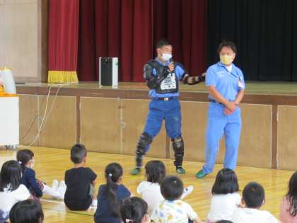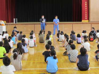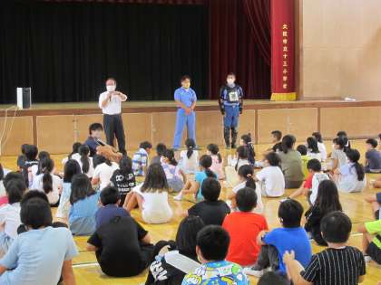 訓練のまとめには講堂に全児童が集まり、セーフティー淀川さんからお話をしていただきました。「十三小学校のみなさんは、先生の指示をよく聞いてすぐに動けていました。しかし、先生がいない状況で不審者が入ってくることもあります。大切な命を自分で守る、という気持ちをもってください。」とお話されると、子ども達は「はい!」と元気よく返事をしていました