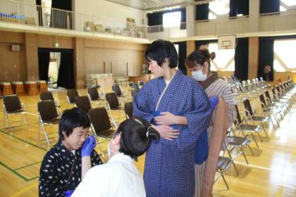 また、この劇には十三小学校の6年生と5年生の児童が8人、役者として参加します。参加する子ども達はセリフがあり、事前のワークショップで演技の練習もしました。他のお友達よりも早い目に給食を食べて、衣装を着たりメイクをしてもらったりして大変身です。可愛らしい「村の子ども達」ができあがりました。