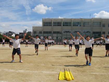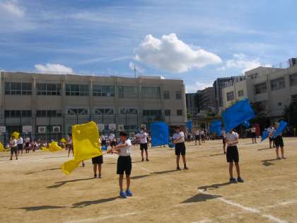 運動会の最後を飾るのは、5年生と6年生の団体演技です。運動場に流れるポップスの軽快な音楽に合わせて、高学年らしいかっこいいダンスを披露しました。