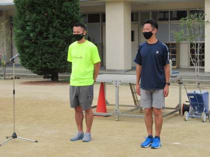 今日、十三小学校に来てくださったのは、陸上競技の荒川大輔さんと宮川洋也さんです。荒川大輔さんは走幅跳の選手で、日本人で9人目の8メートルジャンパーの記録を持っておられます。2007年には日本選手権で初優勝もされ、あの世界陸上の代表にも選ばれた方です。(写真2枚目 左)
