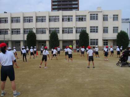 校長先生からゲストお二人の紹介があり、さっそく講師の方の掛け声に合わせて準備運動からスタートしました。
