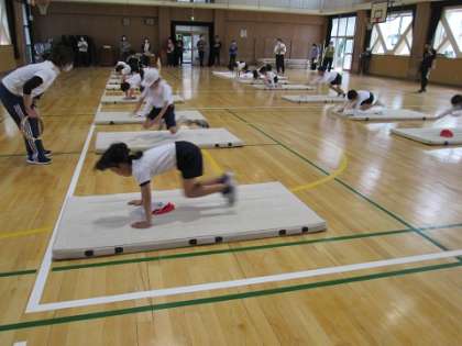 今年度、十三小学校ではテーマを「運動する楽しさと喜びを実感できる体育科の学習」と設定し、体育の授業について研究に取り組んでいます。今日は研究授業の第1回目として、2年1組でマット遊びの研究授業を行いました。