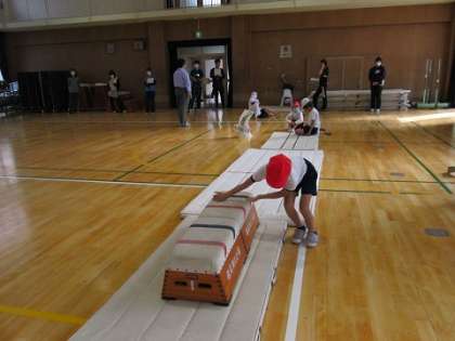 次はグループで協力して、4つのコースをつくります。それぞれのコースの横には三角コーンにイラストが貼ってあり、そのコースでどんな動きをするかがわかりやすくなっています。ウサギになって両足ジャンプで跳び越えたり、ワニになって体を低くしてゴムひもの下をくぐったり、カエルになってマットや跳び箱をまたぎ越したり。