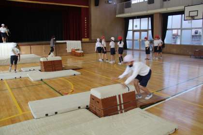 5年生は体育の「めざせ!跳び箱の達人!」という単元で、開脚跳びや抱え込み跳び、台上前転といった技に挑戦しています。今回は台上前転の練習をする時間を、研究授業として行いました。