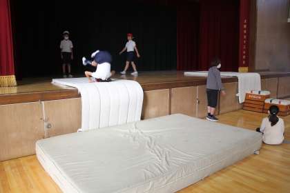 まずは準備体操に「ねこちゃん体操」をして、ストレッチで体をほぐします。次に先生といっしょに台上前転の技のポイントを確認して、さっそく跳び箱の練習開始です。跳び箱にマットを被せて幅を広くした場や、低い段でつくった場など、技の上達度に合わせて場を選ぶことができます。また、講堂の舞台に両足踏み切りで跳び上がったり、舞台の上から前転でふわふわのセーフティーマットに降りたりするなど、台上前転の感覚づくりをする場も用意されています。子ども達は自分の技術や、練習したいポイントに合った場を選んで、繰り返し練習をしました。