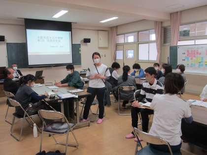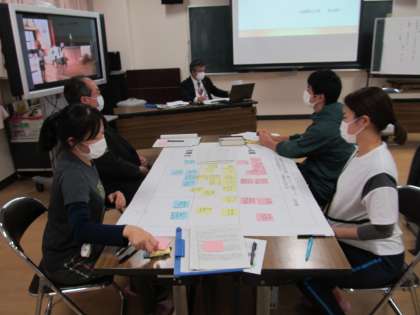 授業者による研究授業のふりかえりに続けて、グループに分かれて討議をしました。児童が自分の課題にあった練習の場を選べることや、準備体操でのストレッチの取り入れ方等、感想や意見とともにいろいろなアイデアも出されました。