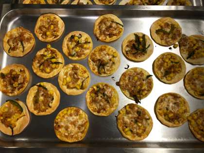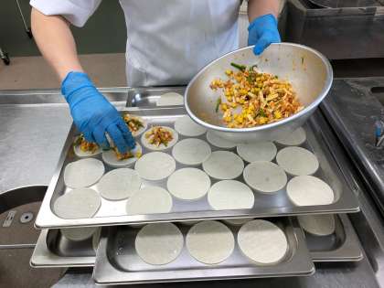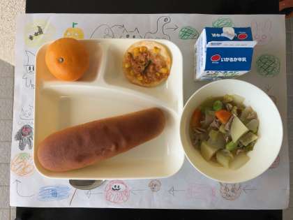 今日は、「変わりピザ」が登場しました。ぎょうざの皮にツナ、コーン、ピーマン、チーズ、ピザソースを混ぜ合わせたものを上にのせて焼き物機で焼きます。児童にも大好評でした。