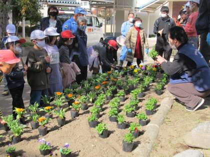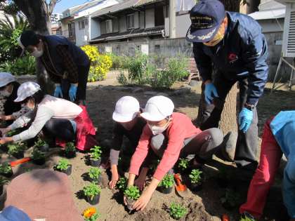 3年生が育苗ポットに種まきをしたキンカセイが育ってきたので、「夢ちゃん花づくり」は花壇づくりの工程に進みました。今回も淀川区役所やボランティアの方がたくさん来てくださって、準備やお手伝いをしてくださいました。
