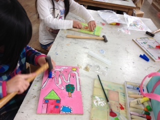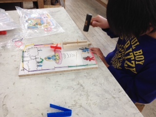 初めは、金づちで指を叩かないかと、びくびくしていた子もいましたが、釘を打ち始めると楽しくなって、どの子も夢中で作業をしていました。ビー玉の通り道を確かめながら何度も改良を加える子もいました。