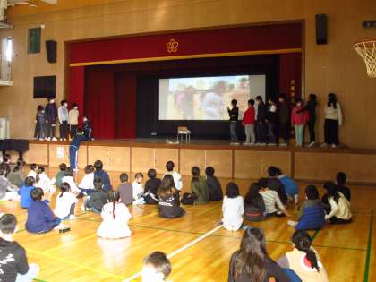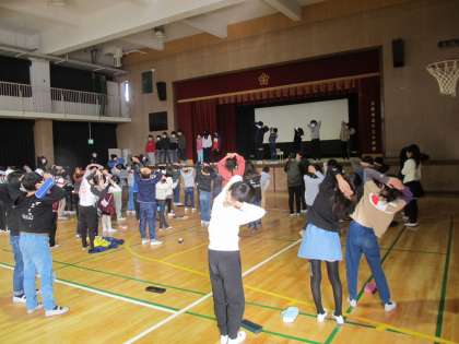 運動委員会の児童からは、「免疫力を高めるために運動がとても大切だ」という発表がありました。外で運動したり元気よく遊んだりすることで、心も体もスッキリして身体の免疫力は高まります。運動委員会の児童が簡単なストレッチも教えてくれて、みんなで一緒に体操をしました。