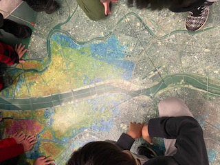 南海トラフ地震の津波で浸水する地域に、自分たちの地域が入っているか確認したり、大地震が来た時にどのように避難すればよいかを考えるビデオを見たりしました。また、高潮が来た時に水防団の方々が閉めている、防潮扉を実際開閉する体験をしました。