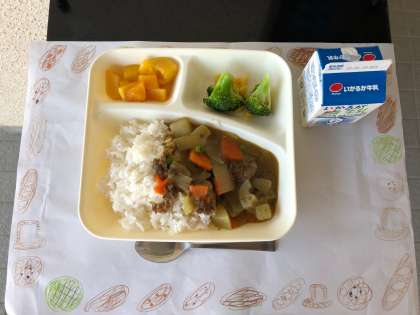 今日は冬野菜のカレーライスでした。冬が旬のれんこん、だいこんが入ったカレーライスです。いつもと違う歯ざわりや食感を感じられるおいしいカレーライスでした。