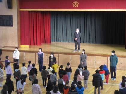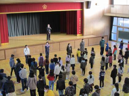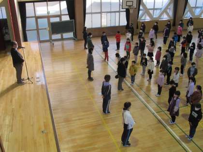 今朝の児童朝会では、校長先生が自らの体験を子ども達にお話しされました。「26年前の阪神淡路大震災のとき、校長先生は淀川区の中学校で社会科を教える先生をしていました。兵庫や大阪で、地震や火事で多くの方が命を落とされました。そして先生が勤めていた中学校には、お家が倒壊した人や火事で焼け出されてしまった家族が,講堂に避難してきました」。校長先生の震災の体験談を、子ども達は真剣な表情でじっと聞き入っていました。