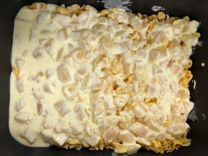3.耐熱容器に、コーンフレークをしき、生地を流しいれる。