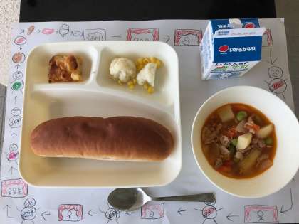 今日は「豚肉と野菜のケチャップ煮、カリフラワーのピクルス、桃のクラフティ、黒糖パン、牛乳」でした。