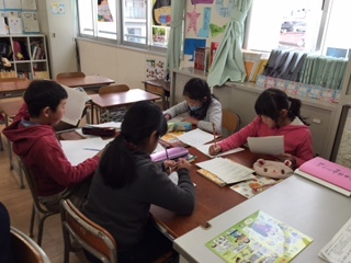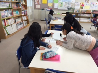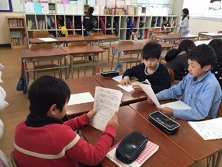 国語の時間に、クラスを二つに分けて学習を進めています。「私たちとテレビ」「私たちとインターネット」など、自分たちの生活を報告する学習単元です。報告したいテーマごとにグループを決め、アンケートを作り、結果と結果からわかることをポスターにして発表します。全部で8グループあるので、4グループずつに分かれています。少人数で取り組めるので、話し合っていることに対してアドバイスがしやすくなっています。