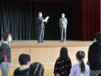 先日、十三小学校の給食室と給食調理員さんが、大阪市から「衛生管理の優秀標」をいただきました。月曜日の児童町会の時間に全児童の前で、校長先生から給食調理員さんに手渡されました。
