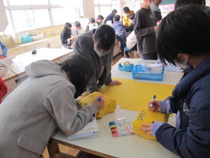 家庭科のエプロンづくりの経験があるので、6年生はミシンの操作は慣れたものです。お兄さんとお姉さんの優しい気持ちを手作りのプレゼントに込めて、丁寧に包装紙で巻いて、きれいに飾って仕上げました。