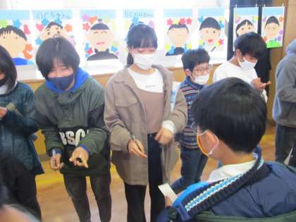 次はたてわり班で輪になって座り、「6年生クイズ」をしました。5年生が司会をして6年生にちなんだクイズを出します。好きな動物や好きな果物など、お兄さんやお姉さんの新しい一面を知って笑い声が溢れていました。