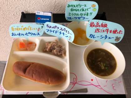 今日は6年生をお祝いする卒業祝い献立でした。近江牛を使用した「カレーシチュー」、スパイスがきいた「フライドチキン」、紅白でおめでたい「おいわいピクルス」、みかんゼリーと和なし(缶)のハーモニーがよく合う「フルーツゼリー」それと「黒糖パン」「牛乳」でした。いつもより、豪華で、見た目もカラフルな給食をみんなでおいしくいただきました。