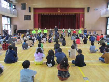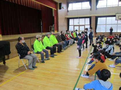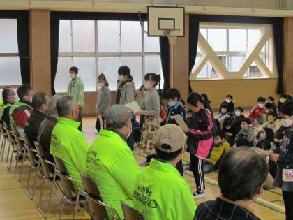 今年度もの頃わずかとなり、一年間、見守り活動をしてくださったみなさんをお招きして、『見守り感謝の会』を開きました。児童朝会の時間に来てくださった方々を、全校児童が拍手でお迎えしました。まずは、十三小学校の子ども達を代表して児童会の5年生がお礼の言葉をスピーチして、子ども達が書いたお礼の手紙をお渡ししました。