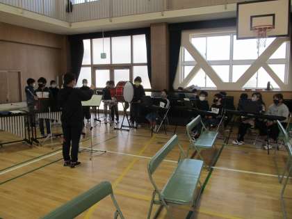 在校生の代表として式に参加する5年生は、新型コロナウイルス感染対策のために今回は呼びかけをすることができません。そこで、卒業生の入場と退場でオルガンや木琴、鉄筋、そして太鼓などを使って合奏をしてくれます。