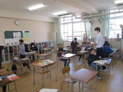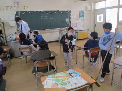 3年生の子ども達は、ホウキやぞうきんをもって教室の大掃除をしていました。机やロッカーの中など、ふだんは掃除をしないようなところまで、ごみを集めてピカピカにふきました。